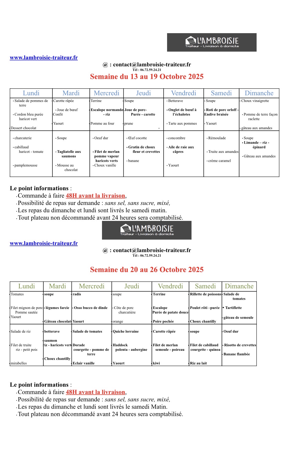 Menu du jourles menus du jours sont au choix Tous les jours un choix de menu vous sera proposé. Il sera uniquement composé de produit frais et cuisiné maison, dans le respect des régles d'hygiénes et de sécurité HACCP. Toutefois, Il peut y avoir quelques changements de dernière minute du fait de l'arrivage de certain produits. L'Ambroisie vous propose un choix varié de viandes, de poissons, de crudité ainsi que de dessert réalisé maison (hors yaourts de ferme et fruits). Tous les menus vous seront envoyés chaque mois afin de pouvoir commander vos plateaux le plus tôt possible (au minimum 48H avant le jour de livraison). Pour ceci rien de plus simple faite une demande de devis et nous repondrons à vos attentes dans les plus bref délais. Toutes l'équipes de l'Ambroisie vous souhaitent une bonne visite et un trés bon appétit. ![]() Si vous possédez déjà les menus alors vous pouvez directement passer commande en précisant le menu ainsi que la date de livraison. Un mail ou SMS de confirmation vous sera alors envoyé. L'Ambroisie vous remercie de votre confiance et vous souhaite bon appétit. |